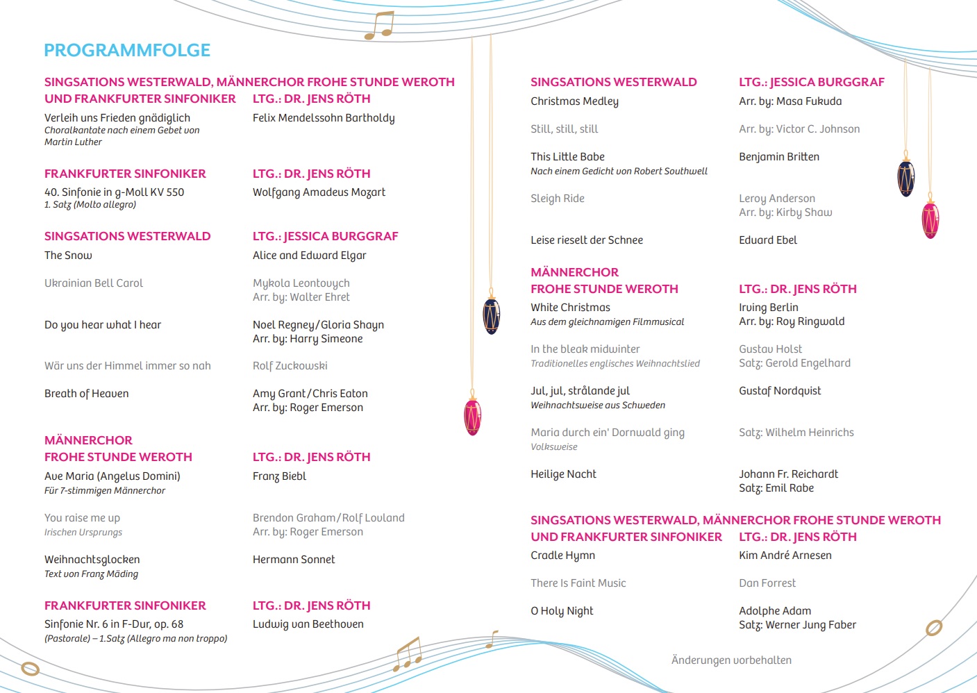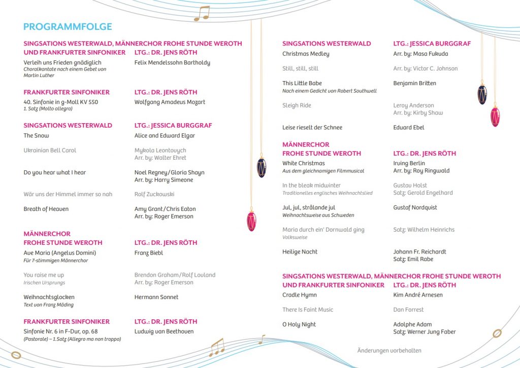 Mit der Aufforderung „Gaudete…“ – „Freut Euch…“ wird in der Vorfreude auf Weihnachten der dritte Advent eingeleitet. Da lag es nahe, diesen Appell auch unserem Adventskonzert 2025 voranzustellen. „Freut Euch…“ richtet sich nämlich in der Interpretation der FROHEN STUNDE in erster Linie an die Besucher des anstehenden Konzerts zum krönenden Abschluss des Jubiläumsjahrs, weil es erneut gelungen ist, mit den Singsations Westerwald und den Frankfurter Sinfonikern herausragende musikalische Gäste zu gewinnen.
